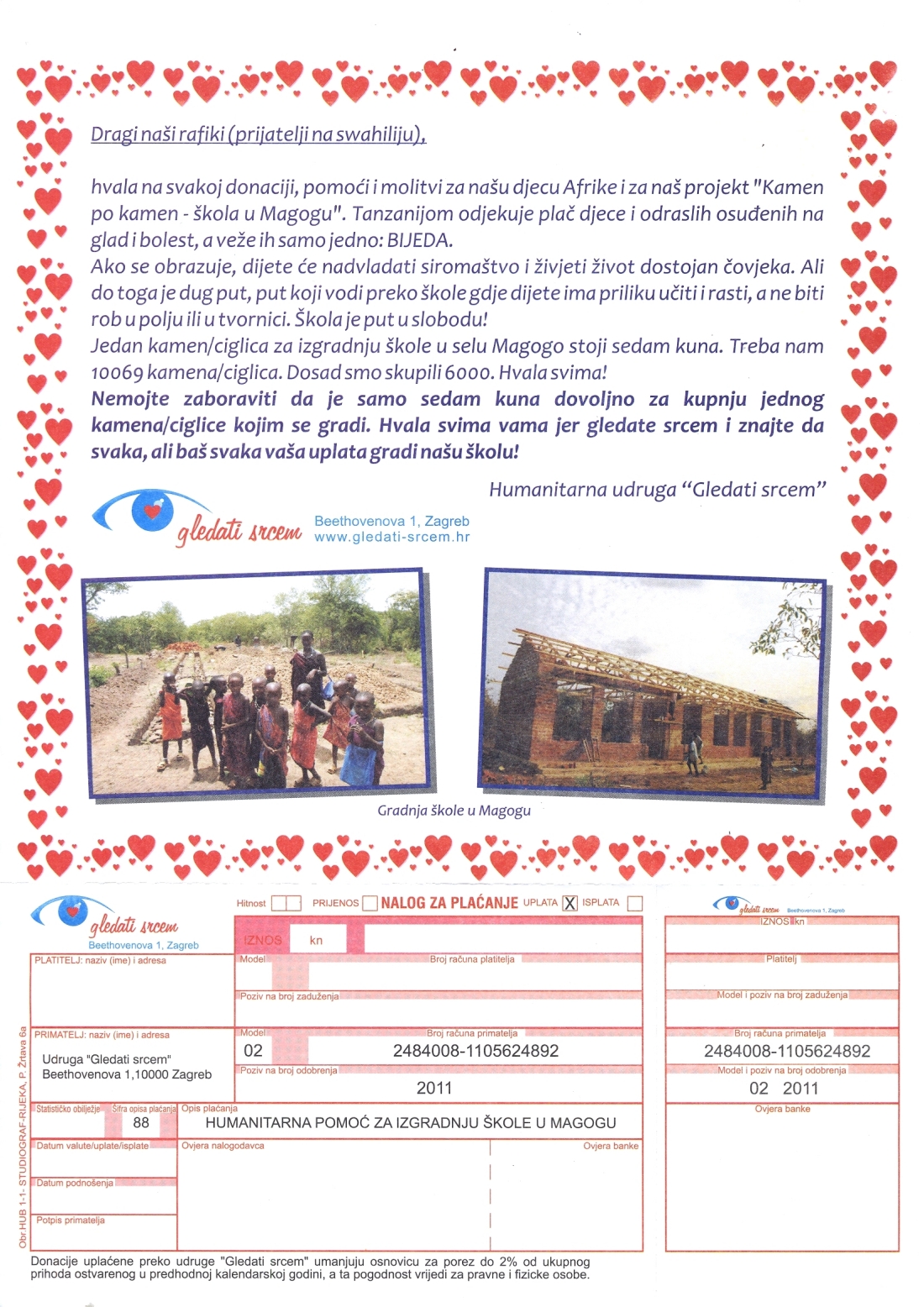 Donations may be paid into the gyro account of the Charity NGO ''Gledati srcem'' with Raiffeisen Bank.